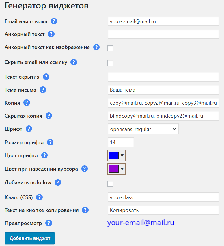 Виджет включает в себя множество полезных функций, которые помогут Вам автоматически защитить email-адреса и другие контакты на Вашем сайте